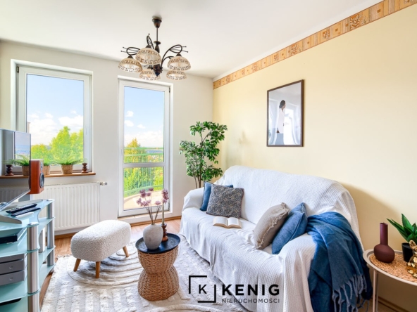 Aranżacja wnętrz: Mieszkanie jest doskonale doświetlone ze względu na południowo-zachodnią ekspozycję i duże przeszklenia. Co istotne, widoku z okien i balkonu nie zasłania (i nie zasłoni) żaden blok, a perspektywa na panoramę miasta i góry w tle jest przepiękna. Balkon, dostępny z salonu, jest zadaszony i swobodnie zmieści stolik z fotelami oraz donice z roślinami – można stąd podziwiać zachody słońca.
