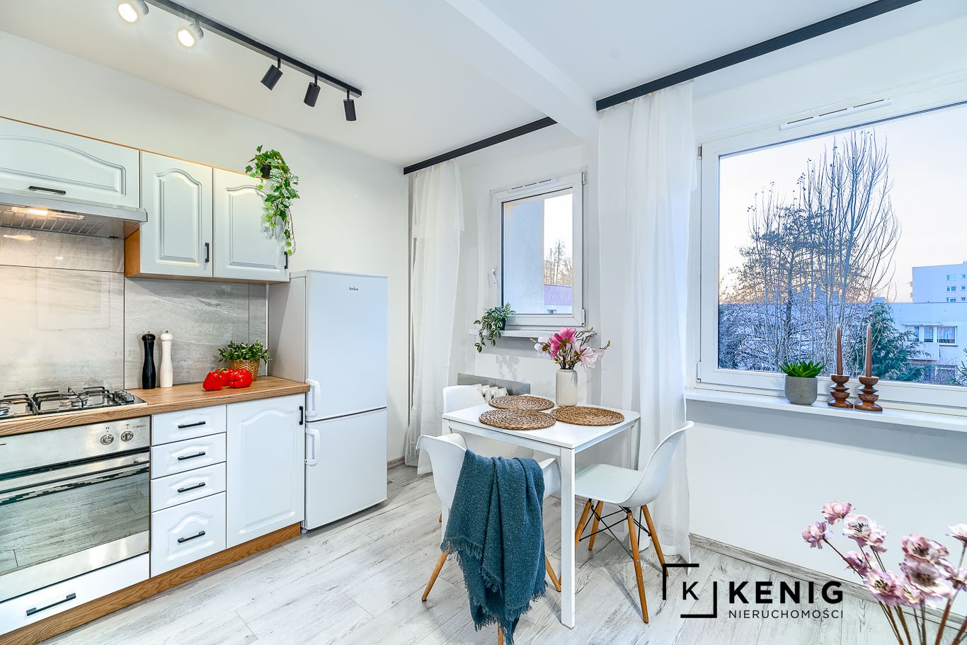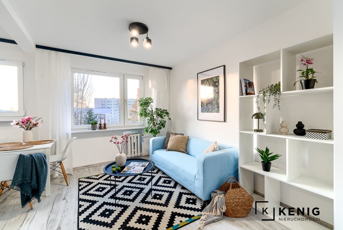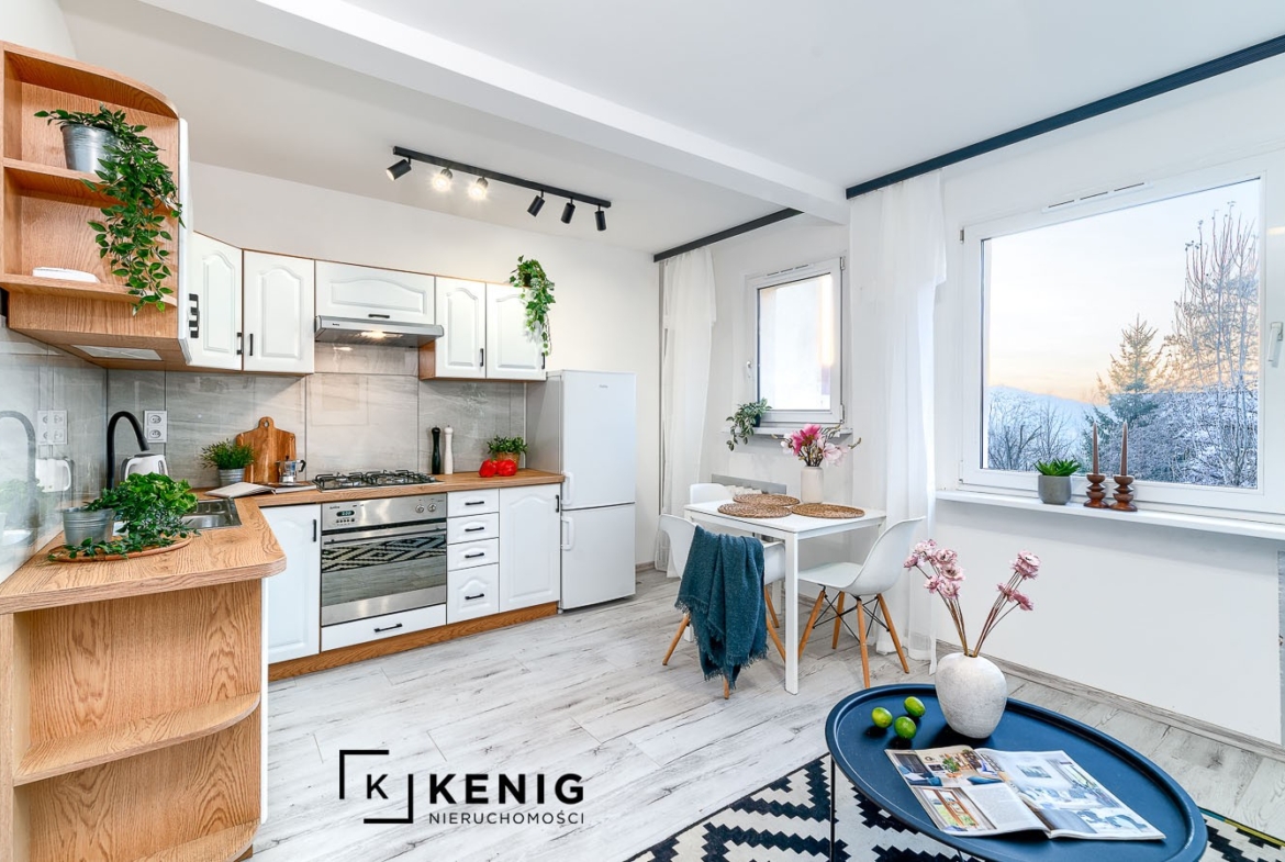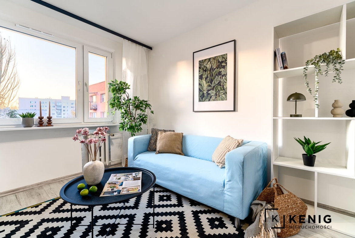 Aranżacja wnętrz: Mieszkanie ma głównie zachodnią ekspozycję – jest doskonale doświetlone w godzinach popołudniowych. Za oknami mnóstwo zieleni i otwarta przestrzeń pomiędzy budynkami, która daje sporo oddechu, a w oddali zarys pasm górskich.