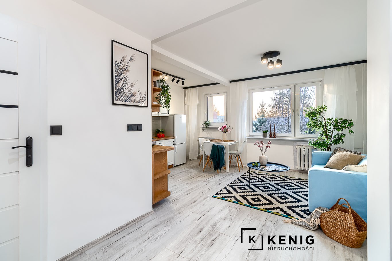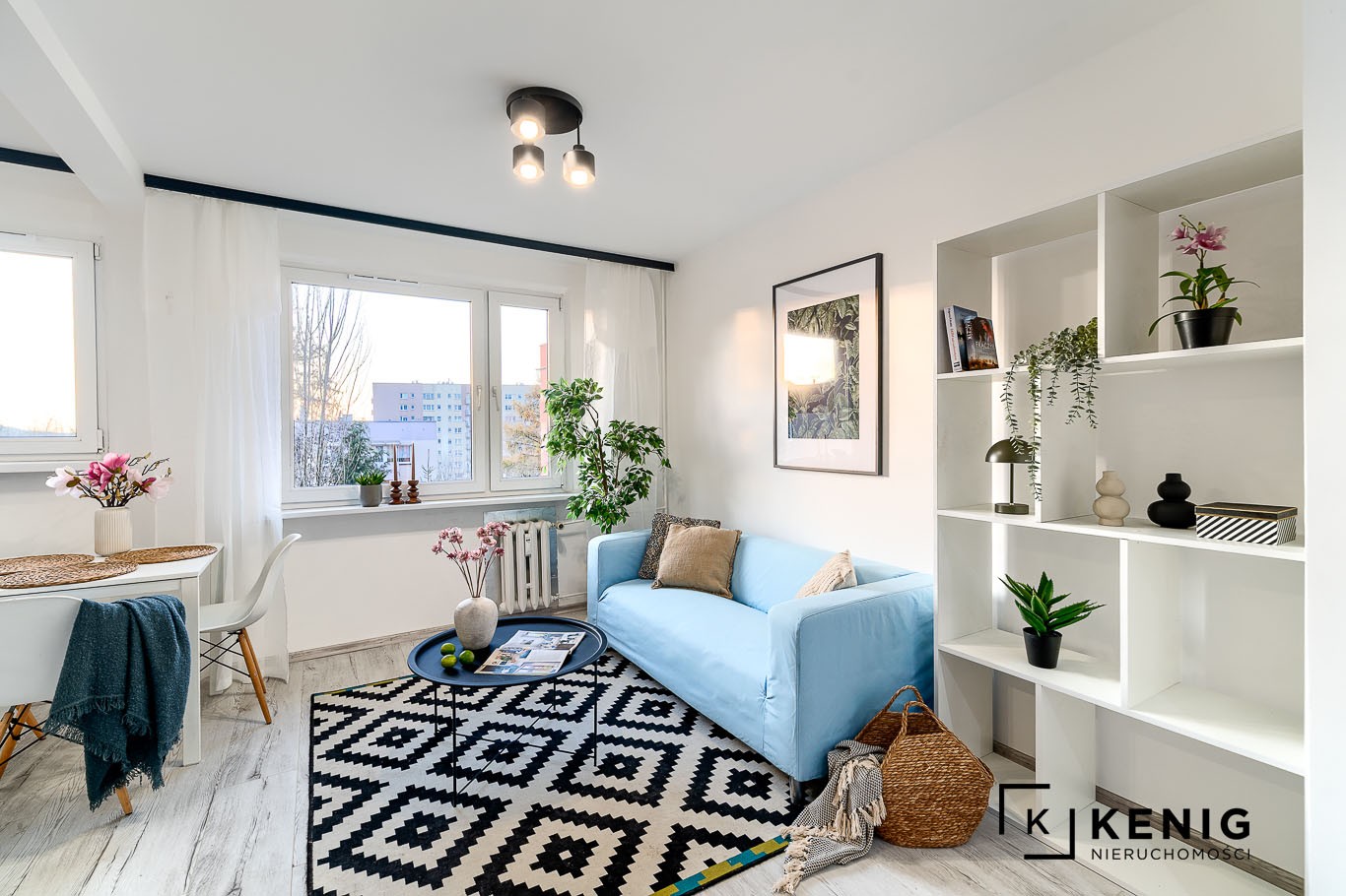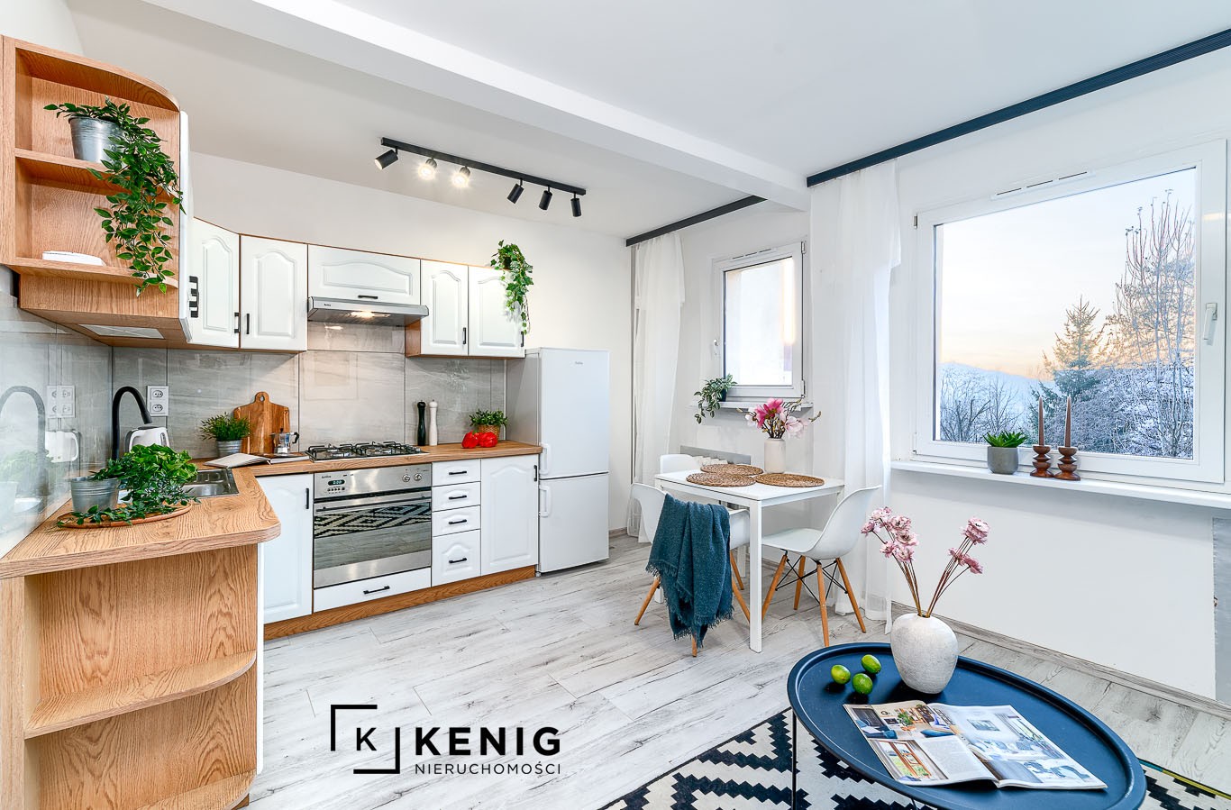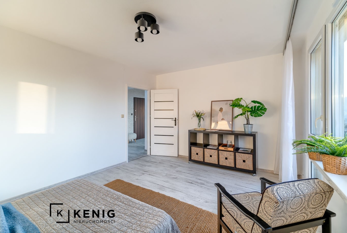 Aranżacja wnętrz: Mieszkanie ma głównie zachodnią ekspozycję – jest doskonale doświetlone w godzinach popołudniowych. Za oknami mnóstwo zieleni i otwarta przestrzeń pomiędzy budynkami, która daje sporo oddechu, a w oddali zarys pasm górskich.