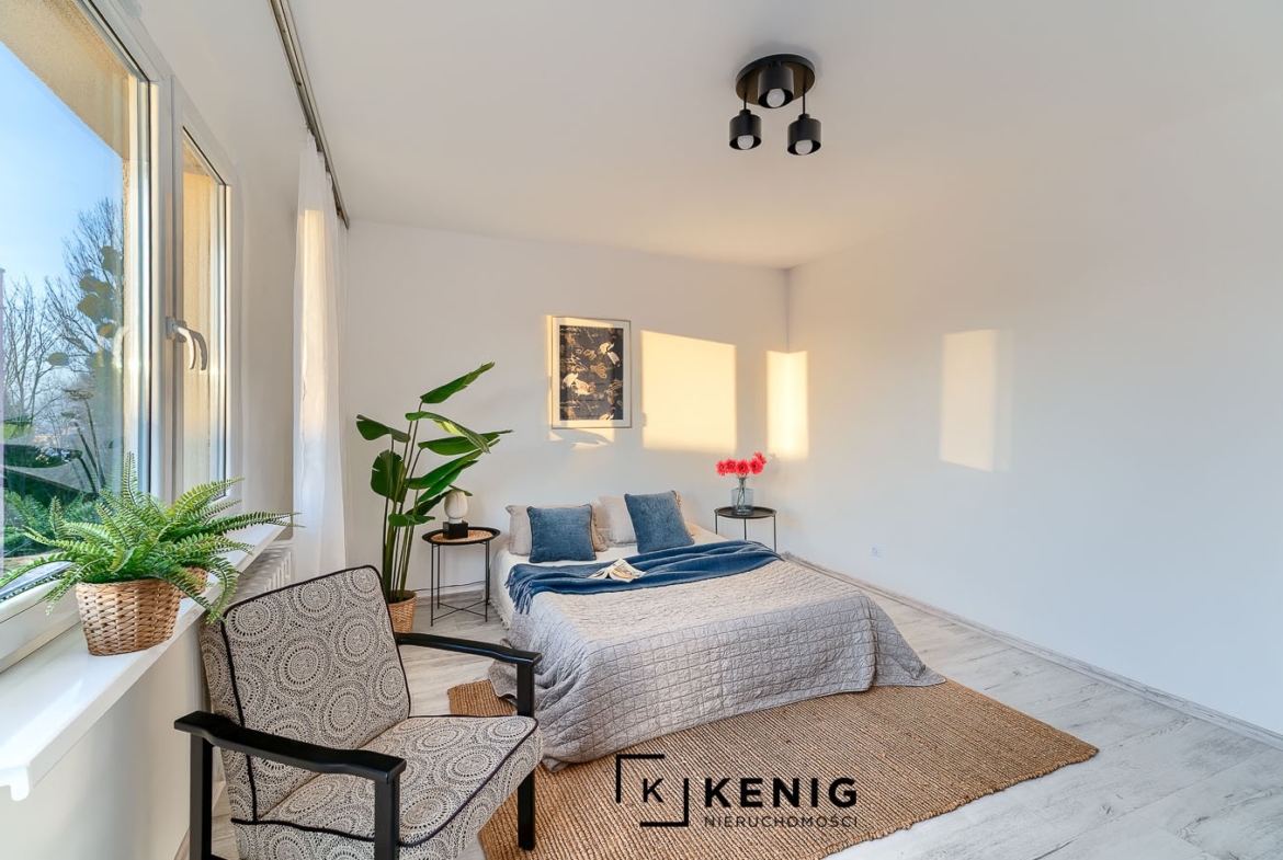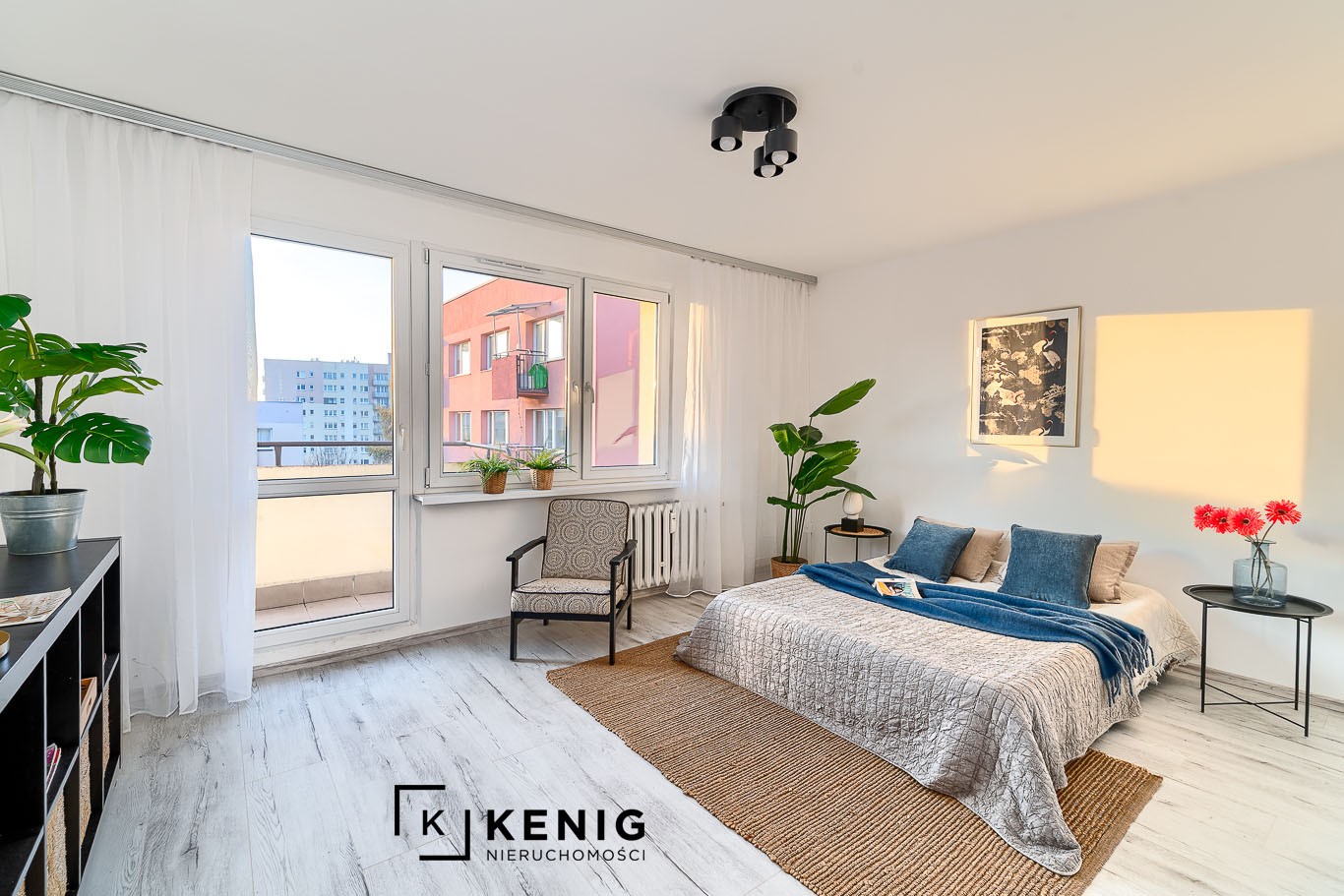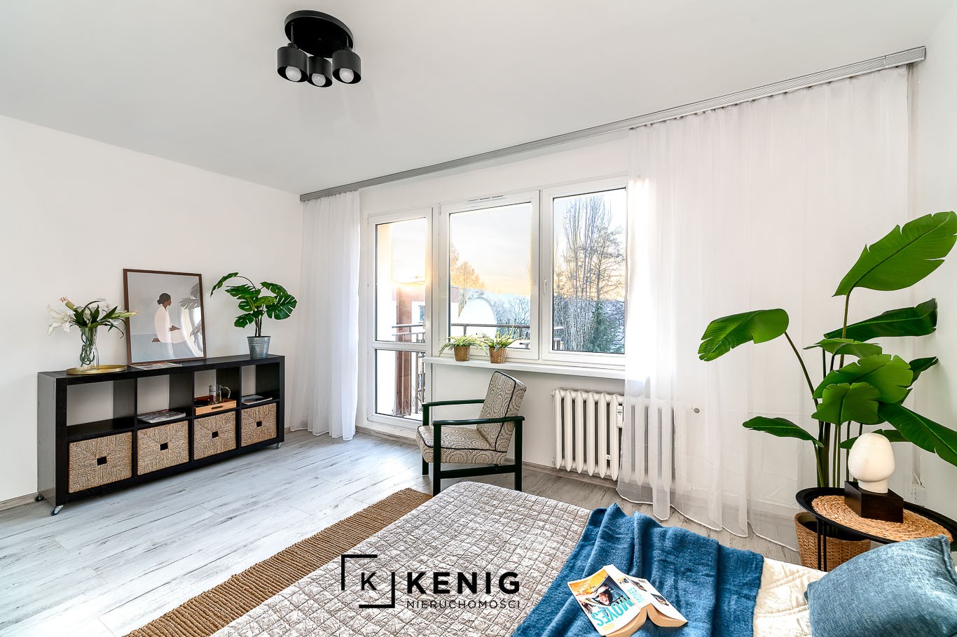 Przestronna sypialnia zmieści podwójne łóżko, zestaw mebli RTV lub biblioteczkę. Wzdłuż ściany sąsiadującej z małym pokojem można zabudować pojemną szafę garderobianą. Balkon, choć może nie imponujących rozmiarów, będzie doskonałym miejscem i na poranną kawę, i na obserwowanie zachodów słońca.