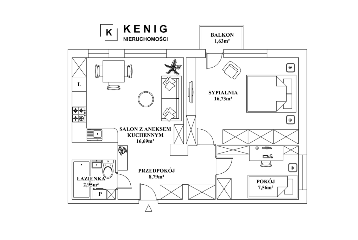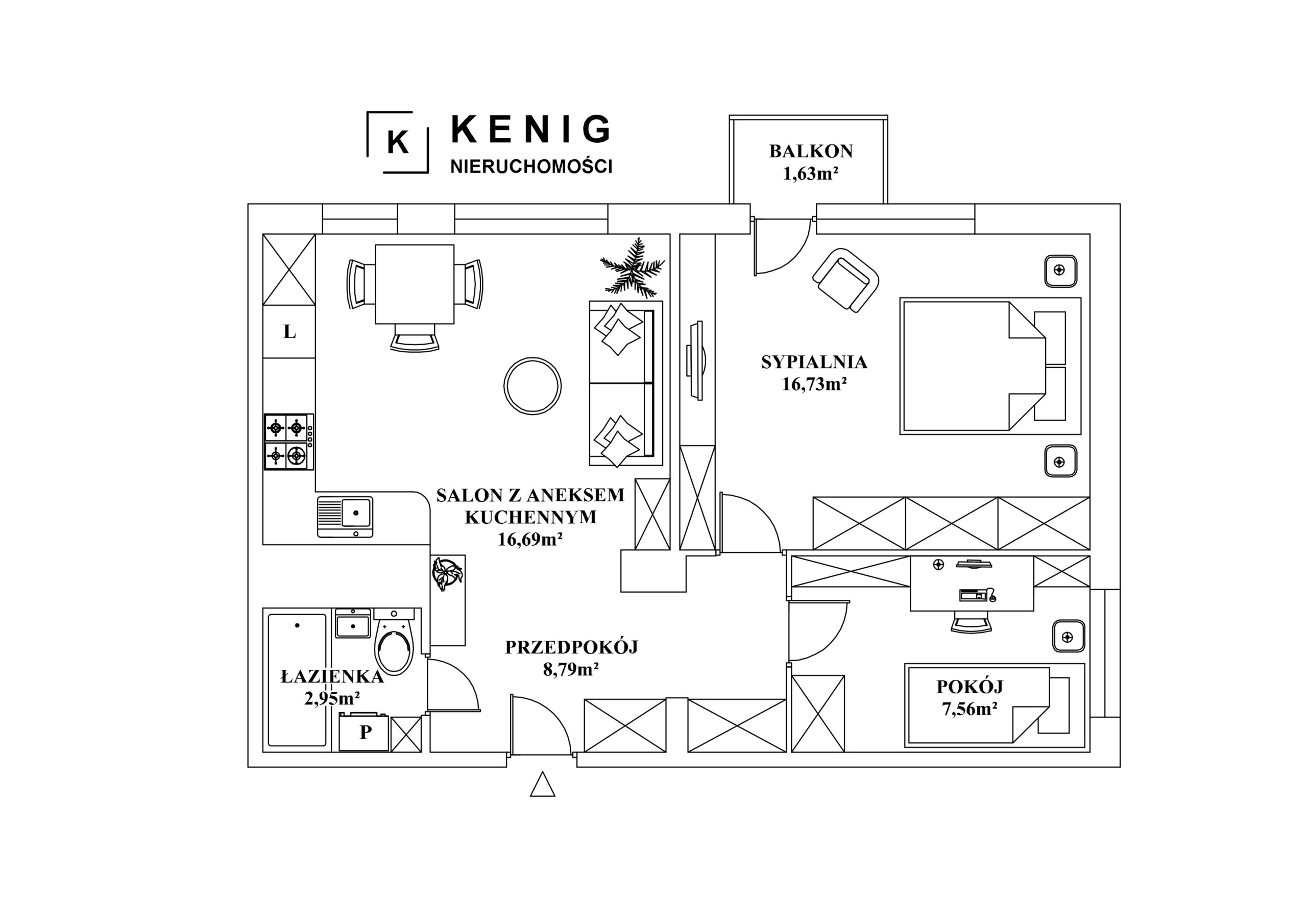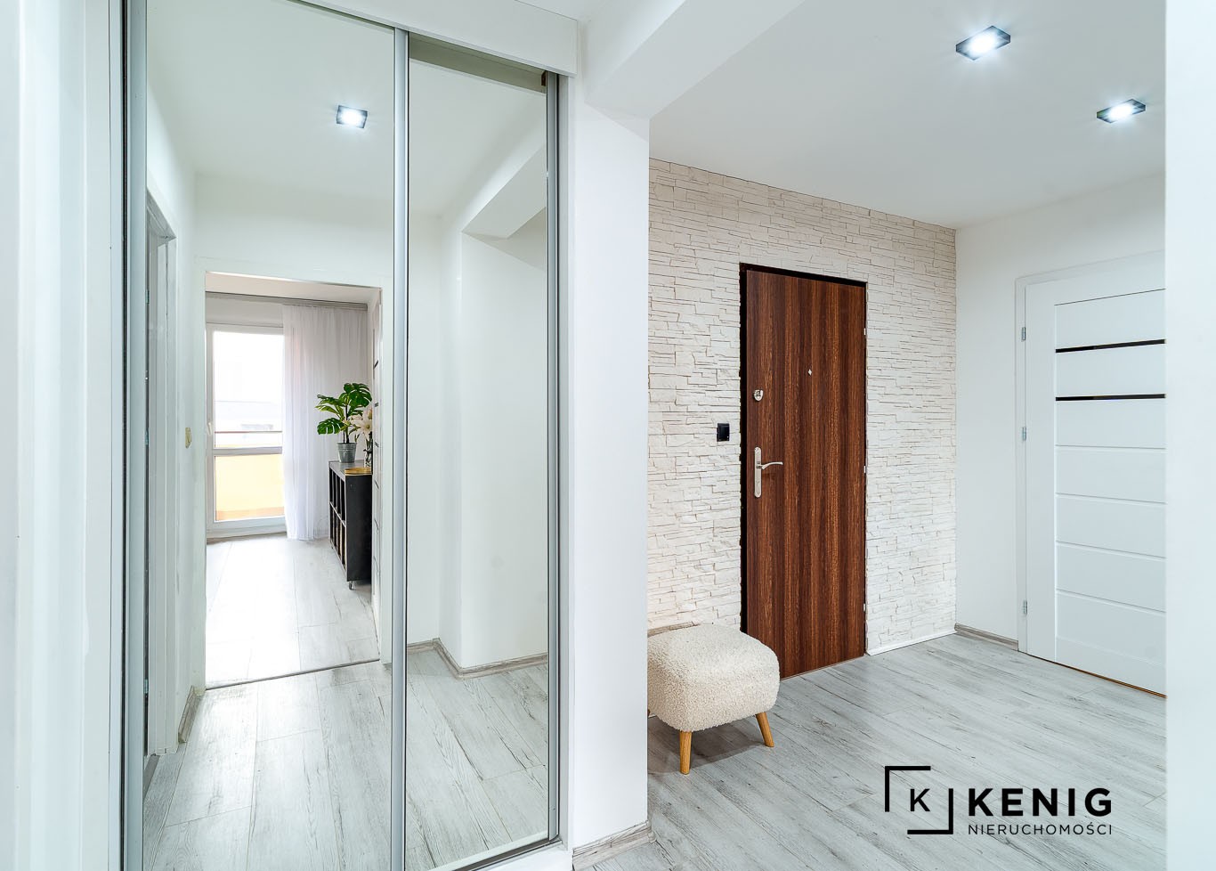 Rozkład pomieszczeń (rzut mieszkania w ofercie): Salon z aneksem kuchennym i jadalnią, sypialnia z balkonem, pokój dziecięcy/gabinet/gościnny, łazienka z wanną i toaletą, przedpokój. Do lokalu przynależy piwnica.