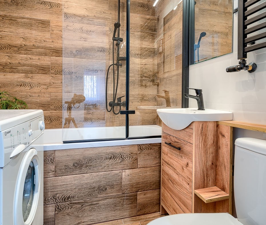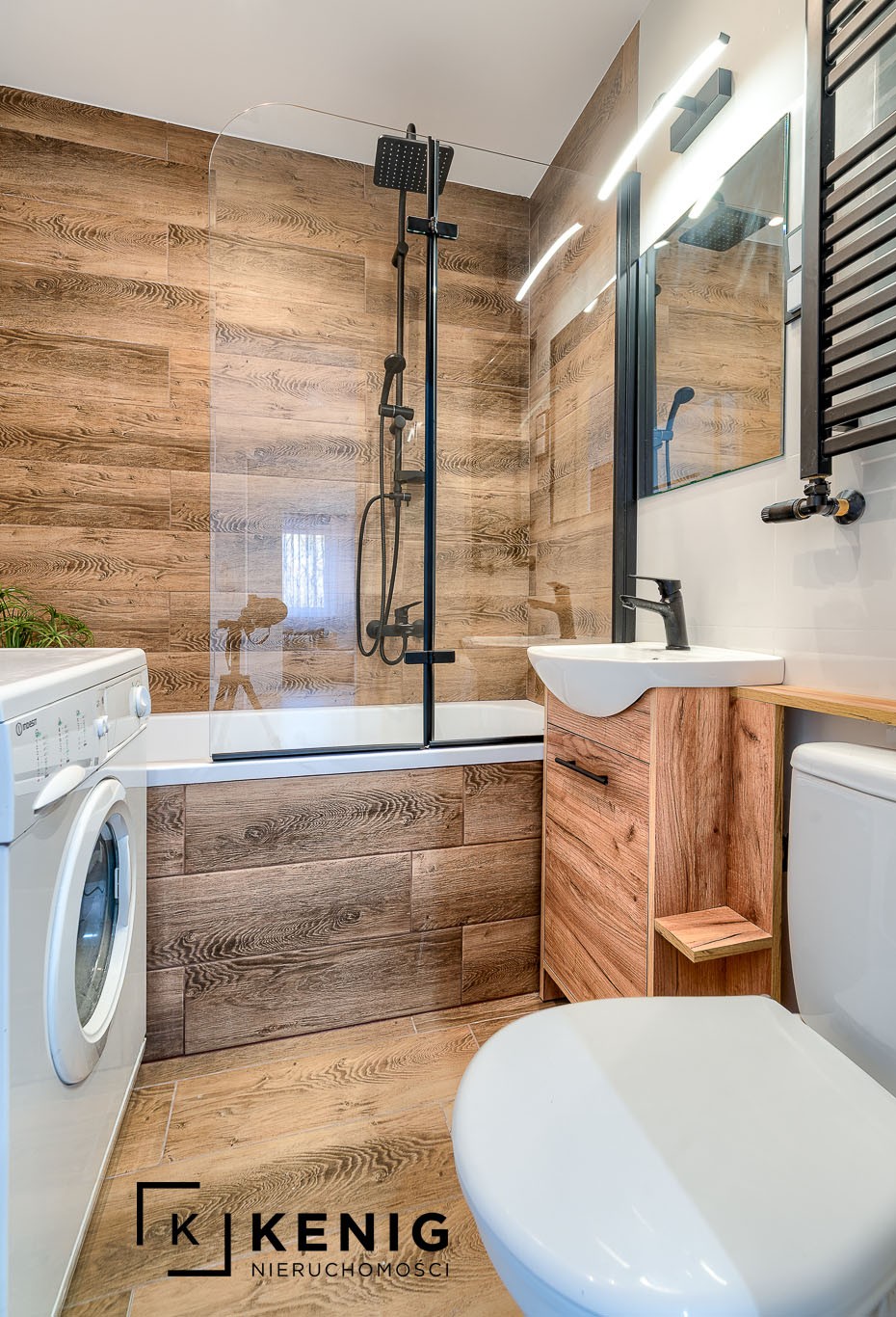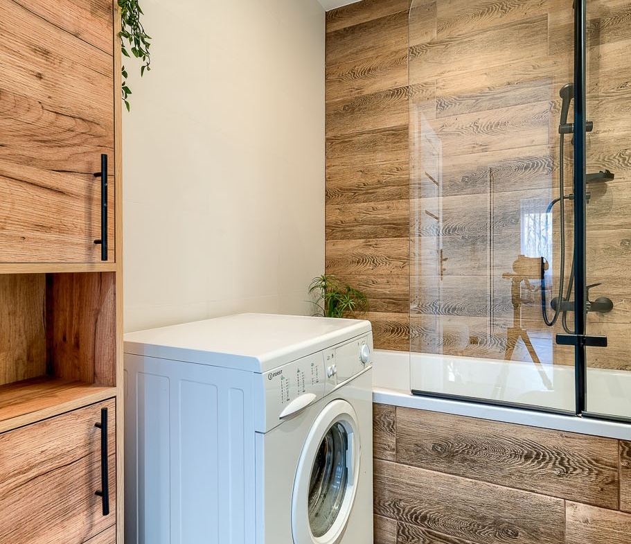 W łazience znajduje się wanna z parawanem prysznicowym, a także pralka, umywalka z lustrem i toaleta. Na podręczne kosmetyki i środki czystości – stojąca wysoka szafka.