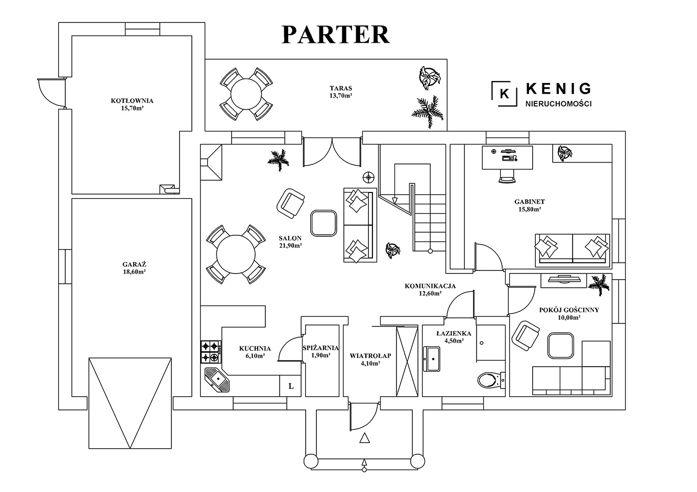 z sofą i fotelami ogrodowymi oraz mnóstwem donic z kwiatami. Pole do popisu będzie tu miała każda kreatywna pani domu… Kuchnia jest bardzo praktycznie wyposażona w niezbędne sprzęty AGD, nie brakuje także blatów roboczych, a spiżarka zapewnia mnóstwo dodatkowej przestrzeni do przechowywania zapasów i kuchennych utensyliów. Na tym poziomie znajdują się także dwa niezależne pokoje, z których jeden (lub oba, przy pracy dwóch osób) może stać się domowym biurem, a drugi pokojem gościnnym lub pokojem dla starszego członka rodziny (w tej części parteru znajduje się łazienka