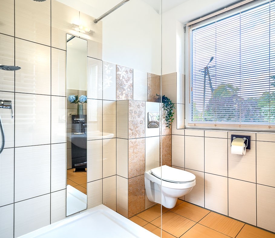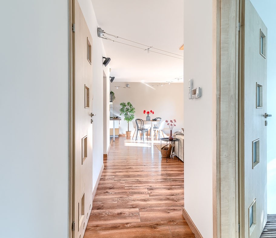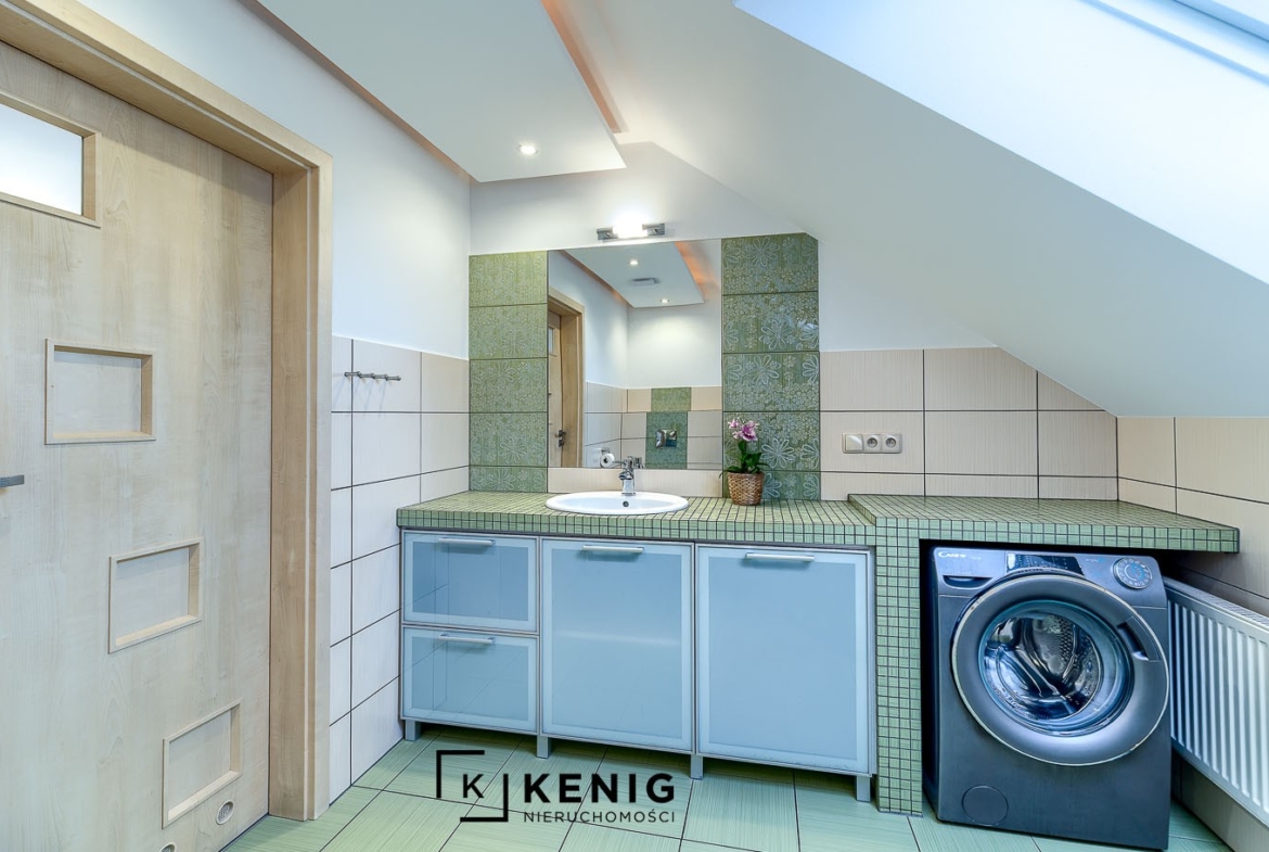 3 pokoje (w tym jeden z garderobą oraz tarasem nad garażem i kotłownią), łazienka (z wanną, bidetem, toaletą, umywalką i pralką), przedpokój.