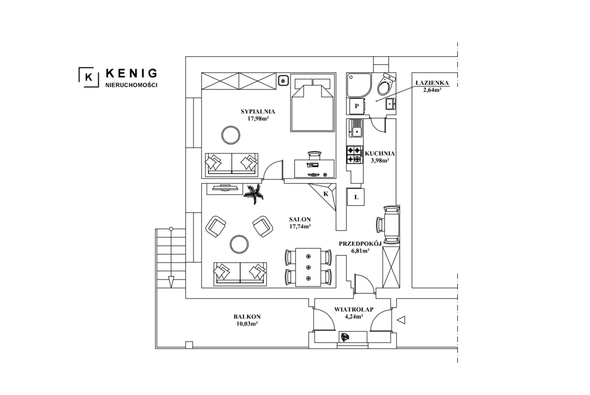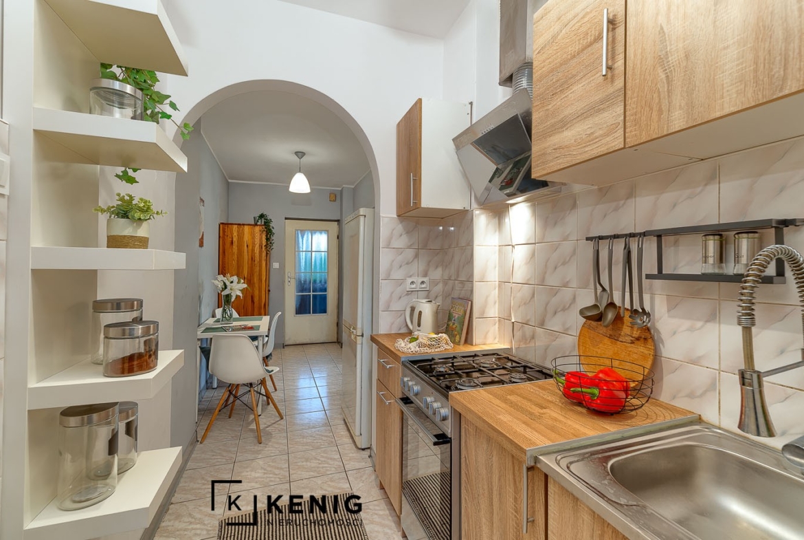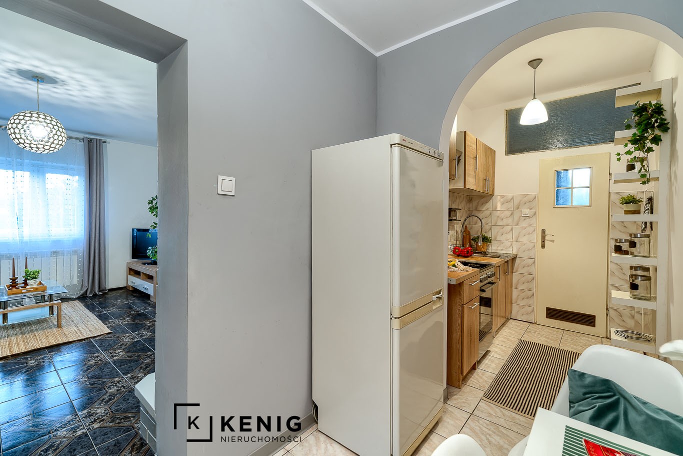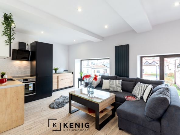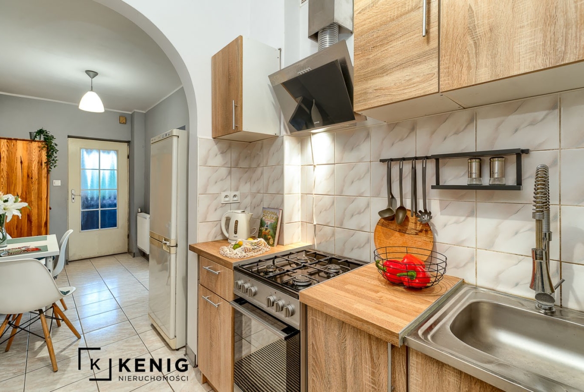 Rozkład pomieszczeń: Mieszkanie zlokalizowane jest na wysokim parterze w budynku prywatnym. Posiada ono niezależne wejście bezpośrednio z zewnątrz. Składa się z salonu z jadalnią, dużej sypialni (wejście do niej z salonu), kuchni, łazienki z prysznicem i toaletą, przedpokoju oraz wiatrołapu.
