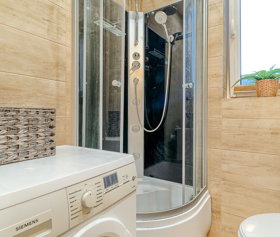 Wyposażenie: Na wyposażeniu znajdują się – w kuchni: meble kuchenne, lodówko-zamrażarka, kuchenka gazowa z piekarnikiem, okap, stół, 3 krzesła; w przedpokoju: szafa; w łazience – kabina prysznicowa, umywalka, toaleta, pralka, grzejnik drabinkowy elektryczny; salon – kanapa rozkładana, stolik okolicznościowy, stół jadalniany z 4-ma krzesłami, szafka RTV, 2 półki wiszące, zegar ścienny, kominek elektryczny, firany, zasłony; sypialnia – łóżko podwójne, stolik nocny, lustro, szafa garderobiana, kanapa rozkładana, firany, zasłony; wiatrołap – lustro, komoda, wieszak stojący.