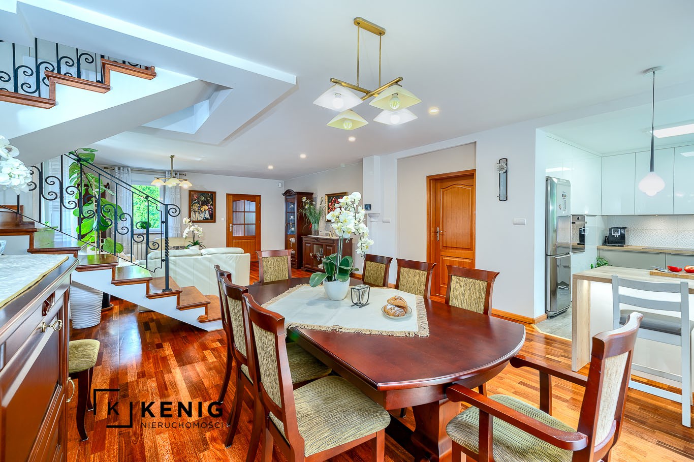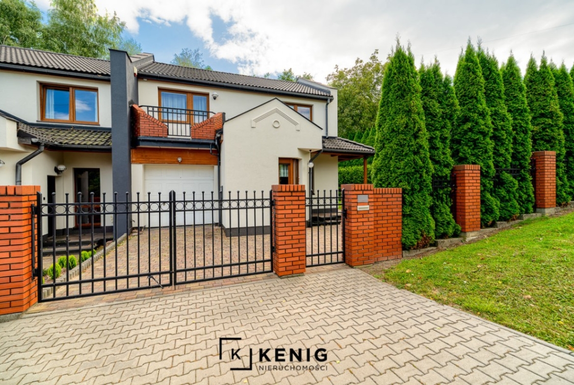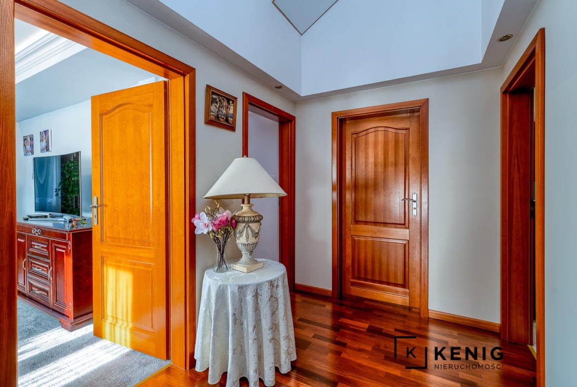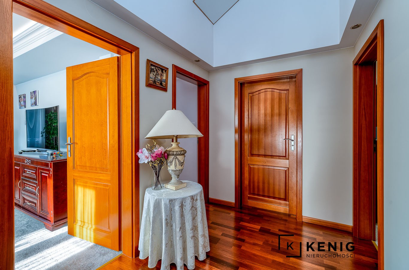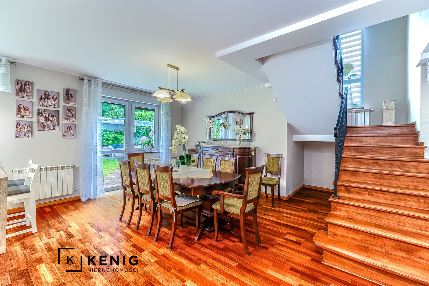 Technologia budowy i stan techniczny: Budynek powstał w 2005 roku. Dach jest wielospadowy, pokryty dachówką cementową w kolorze grafitowym, firmy Braas. Ściany zewnętrzne z pustaka ceramicznego Max (30cm), ocieplone styropianem (10cm), tynk w jasnej kolorystyce. Poddasze użytkowe ocieplone wełną mineralną o grubości 25 cm. Strop gęstożebrowy Ackermana, zapewniający doskonałą izolację akustyczną między kondygnacjami. Okna i drzwi balkonowe PVC. Drzwi wewnętrzne – fornir drewniany. Wszystkie instalacje nowej generacji – elektryczna, centralnego ogrzewania (miedź) i wod.-kan., a także nowy kocioł c.o. z 2025r. (piec gazowy marki Vaillant) z wbudowanym zasobnikiem c.w.u. Instalacja alarmowa. Klimatyzator na klatce schodowej. Na podłogach części dziennej (salon i jadalnia) oraz przedpokoju na poddaszu – parkiet z drewna doussie (bardzo twarde, odporne na ścieranie i wilgoć), w pokojach na poddaszu – wykładziny dywanowe, a w kuchni, łazienkach i wiatrołapie – płytki ceramiczne. Na ścianach gładzie gipsowe.