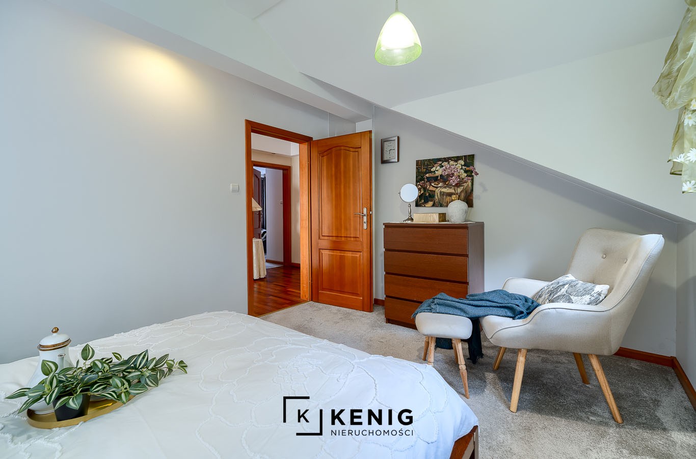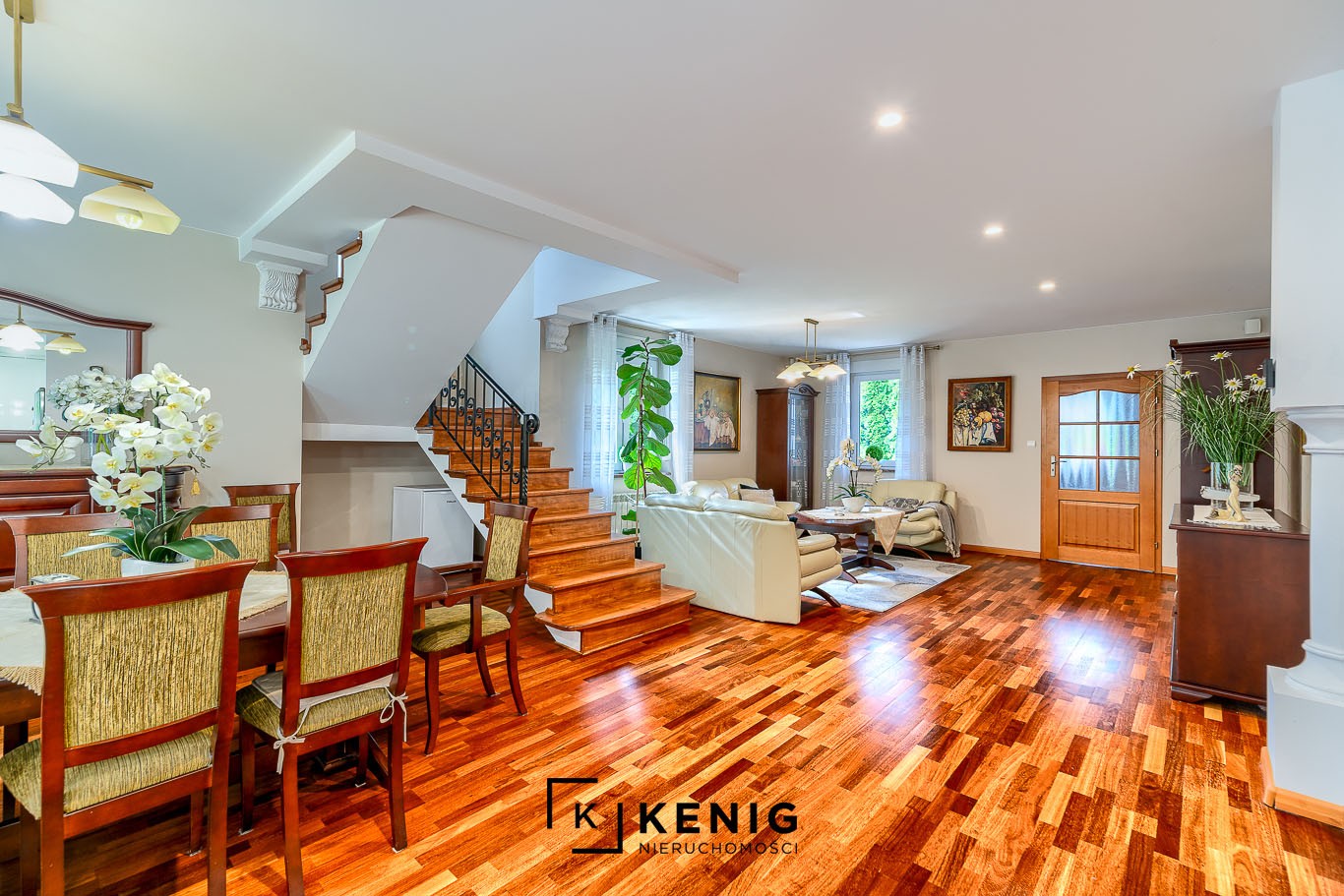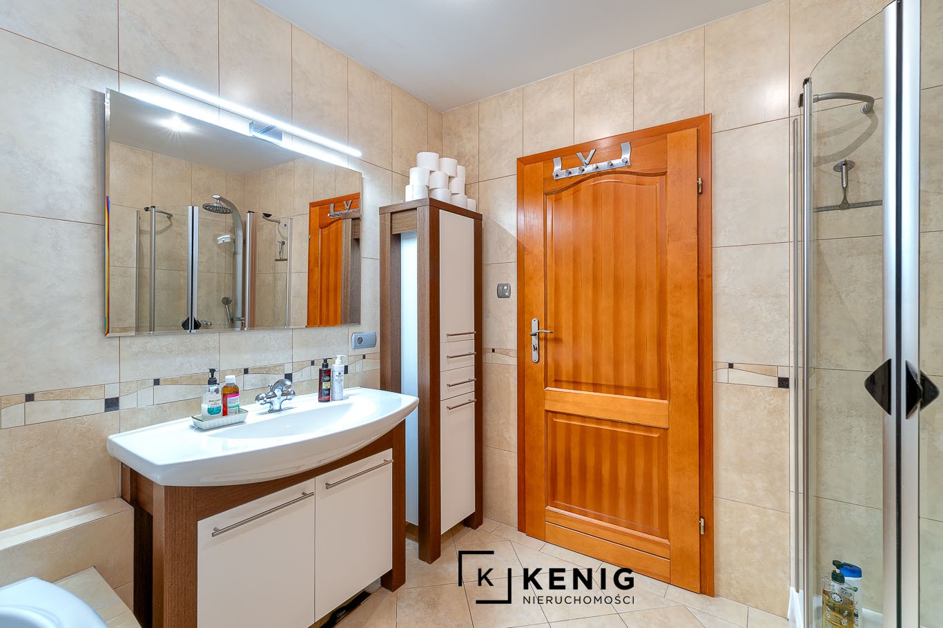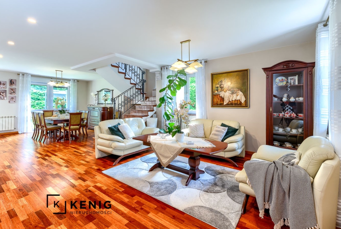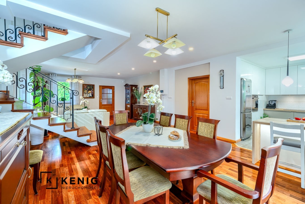 Technologia budowy i stan techniczny: Budynek powstał w 2005 roku. Dach jest wielospadowy, pokryty dachówką cementową w kolorze grafitowym, firmy Braas. Ściany zewnętrzne z pustaka ceramicznego Max (30cm), ocieplone styropianem (10cm), tynk w jasnej kolorystyce. Poddasze użytkowe ocieplone wełną mineralną o grubości 25 cm. Strop gęstożebrowy Ackermana, zapewniający doskonałą izolację akustyczną między kondygnacjami. Okna i drzwi balkonowe PVC. Drzwi wewnętrzne – fornir drewniany. Wszystkie instalacje nowej generacji – elektryczna, centralnego ogrzewania (miedź) i wod.-kan., a także nowy kocioł c.o. z 2025r. (piec gazowy marki Vaillant) z wbudowanym zasobnikiem c.w.u. Instalacja alarmowa. Klimatyzator na klatce schodowej. Na podłogach części dziennej (salon i jadalnia) oraz przedpokoju na poddaszu – parkiet z drewna doussie (bardzo twarde, odporne na ścieranie i wilgoć), w pokojach na poddaszu – wykładziny dywanowe, a w kuchni, łazienkach i wiatrołapie – płytki ceramiczne. Na ścianach gładzie gipsowe.