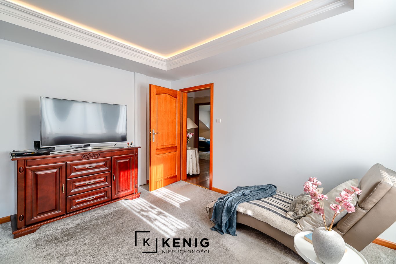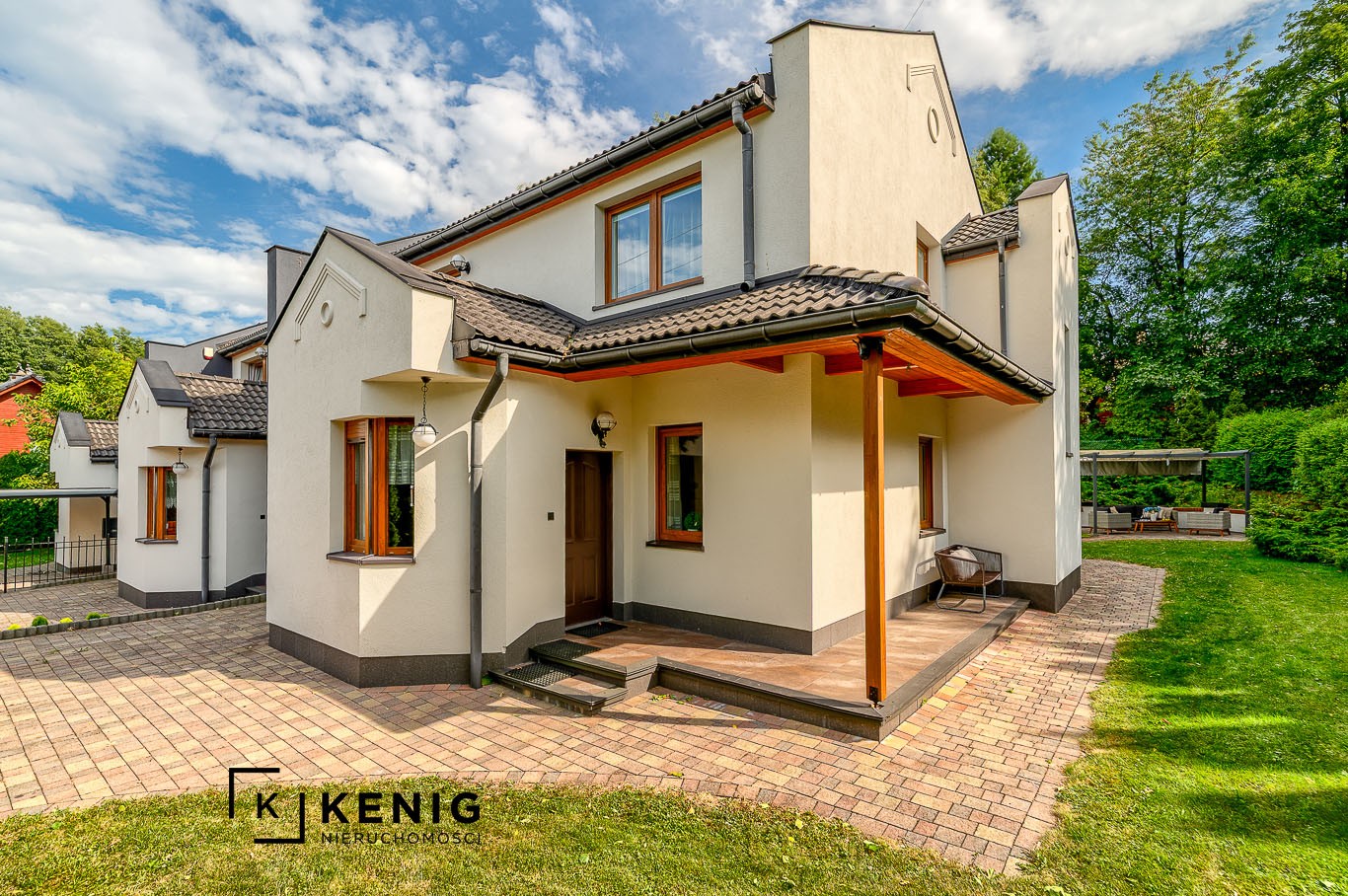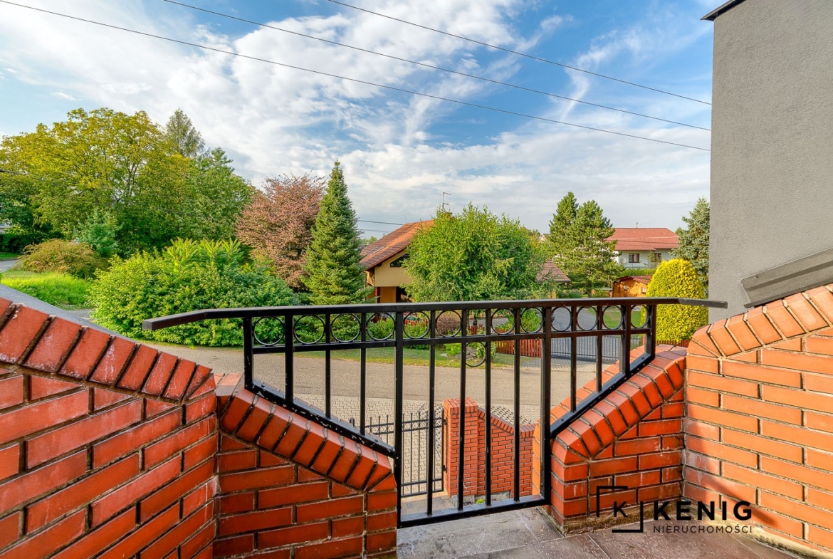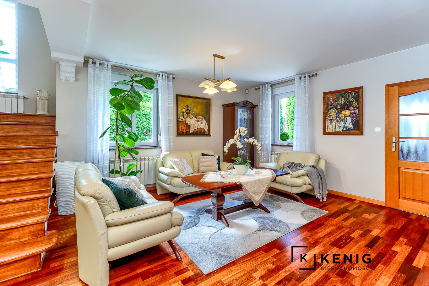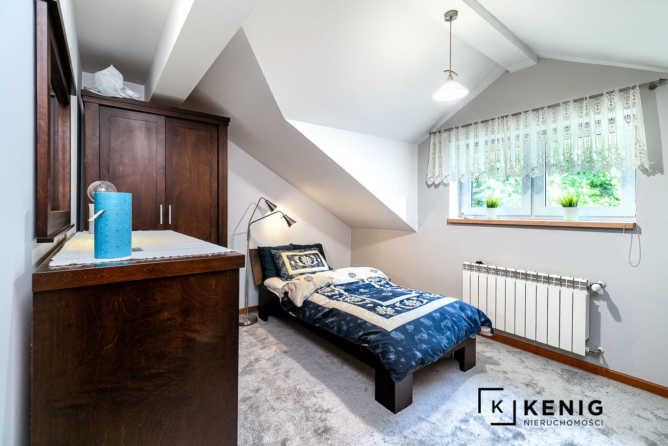 Technologia budowy i stan techniczny: Budynek powstał w 2005 roku. Dach jest wielospadowy, pokryty dachówką cementową w kolorze grafitowym, firmy Braas. Ściany zewnętrzne z pustaka ceramicznego Max (30cm), ocieplone styropianem (10cm), tynk w jasnej kolorystyce. Poddasze użytkowe ocieplone wełną mineralną o grubości 25 cm. Strop gęstożebrowy Ackermana, zapewniający doskonałą izolację akustyczną między kondygnacjami. Okna i drzwi balkonowe PVC. Drzwi wewnętrzne – fornir drewniany. Wszystkie instalacje nowej generacji – elektryczna, centralnego ogrzewania (miedź) i wod.-kan., a także nowy kocioł c.o. z 2025r. (piec gazowy marki Vaillant) z wbudowanym zasobnikiem c.w.u. Instalacja alarmowa. Klimatyzator na klatce schodowej. Na podłogach części dziennej (salon i jadalnia) oraz przedpokoju na poddaszu – parkiet z drewna doussie (bardzo twarde, odporne na ścieranie i wilgoć), w pokojach na poddaszu – wykładziny dywanowe, a w kuchni, łazienkach i wiatrołapie – płytki ceramiczne. Na ścianach gładzie gipsowe.