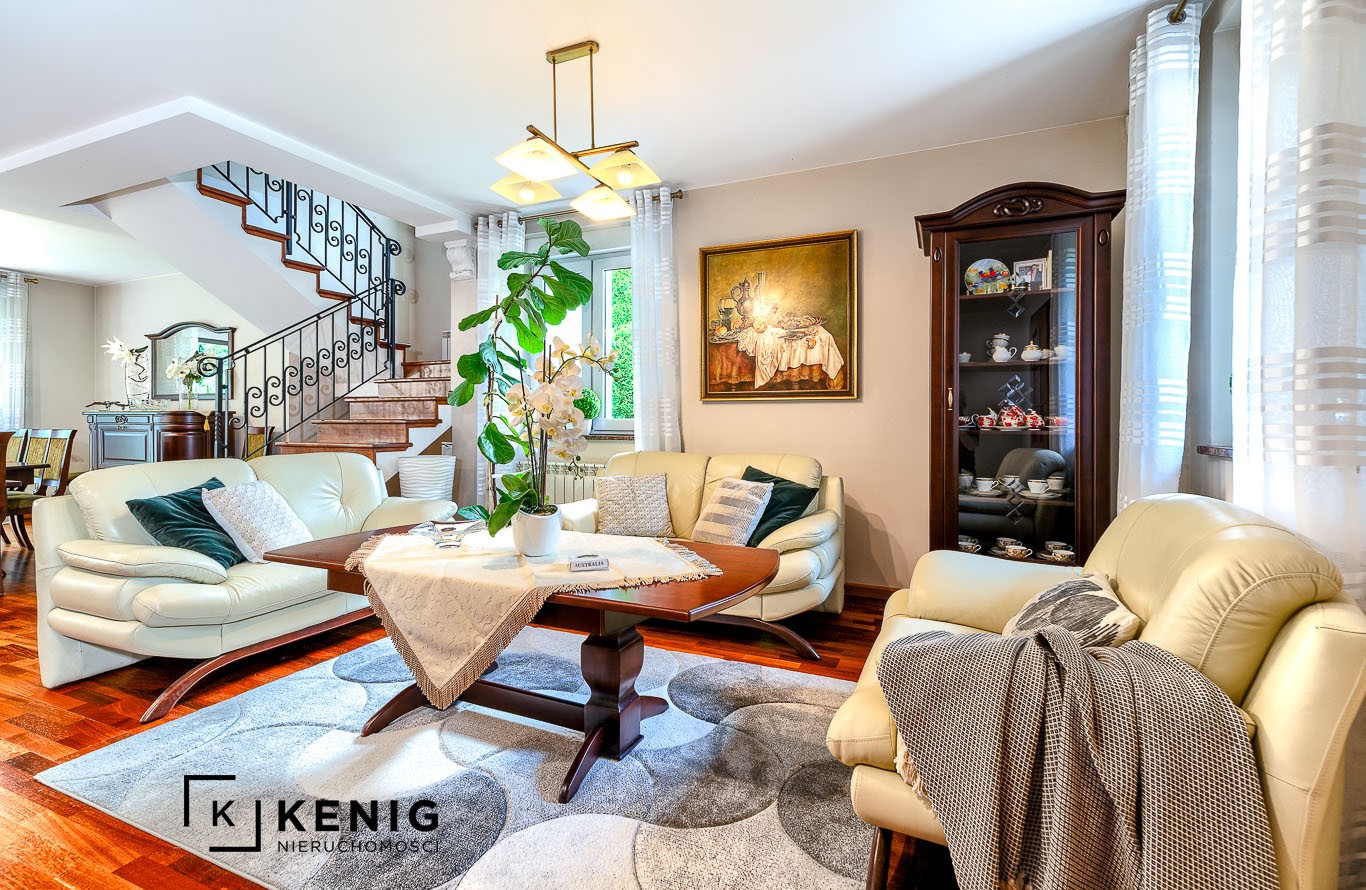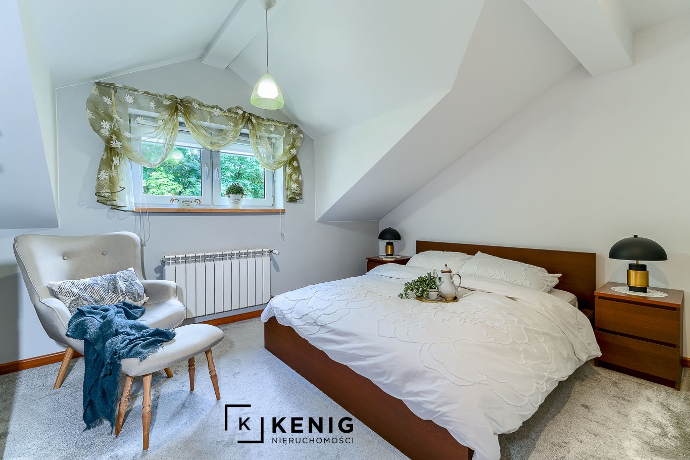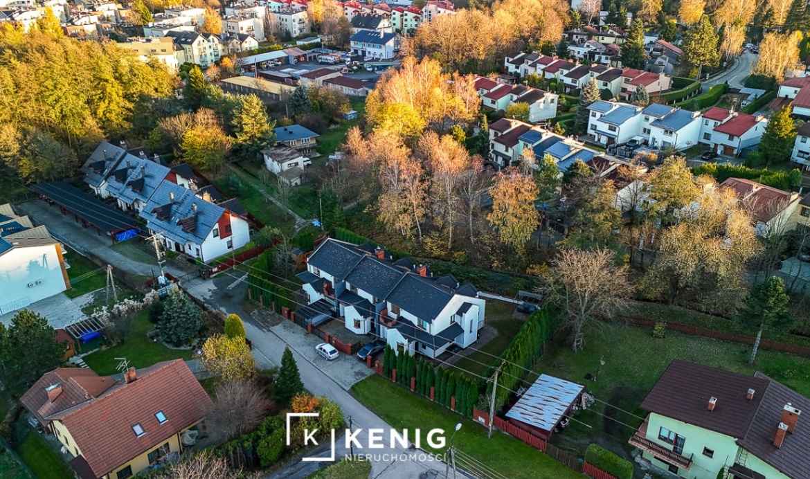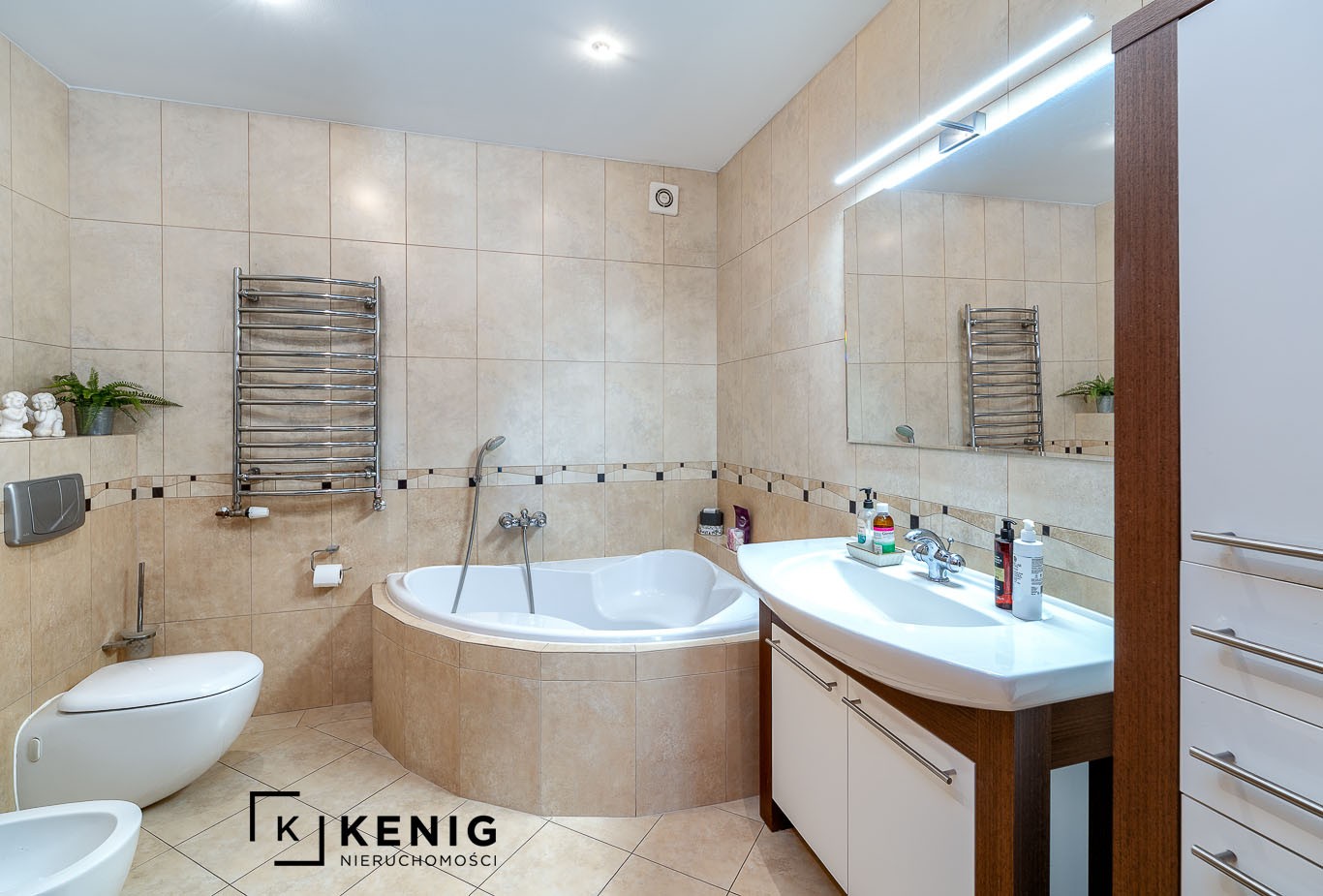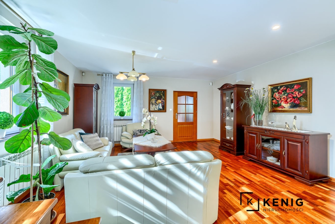 Technologia budowy i stan techniczny: Budynek powstał w 2005 roku. Dach jest wielospadowy, pokryty dachówką cementową w kolorze grafitowym, firmy Braas. Ściany zewnętrzne z pustaka ceramicznego Max (30cm), ocieplone styropianem (10cm), tynk w jasnej kolorystyce. Poddasze użytkowe ocieplone wełną mineralną o grubości 25 cm. Strop gęstożebrowy Ackermana, zapewniający doskonałą izolację akustyczną między kondygnacjami. Okna i drzwi balkonowe PVC. Drzwi wewnętrzne – fornir drewniany. Wszystkie instalacje nowej generacji – elektryczna, centralnego ogrzewania (miedź) i wod.-kan., a także nowy kocioł c.o. z 2025r. (piec gazowy marki Vaillant) z wbudowanym zasobnikiem c.w.u. Instalacja alarmowa. Klimatyzator na klatce schodowej. Na podłogach części dziennej (salon i jadalnia) oraz przedpokoju na poddaszu – parkiet z drewna doussie (bardzo twarde, odporne na ścieranie i wilgoć), w pokojach na poddaszu – wykładziny dywanowe, a w kuchni, łazienkach i wiatrołapie – płytki ceramiczne. Na ścianach gładzie gipsowe.