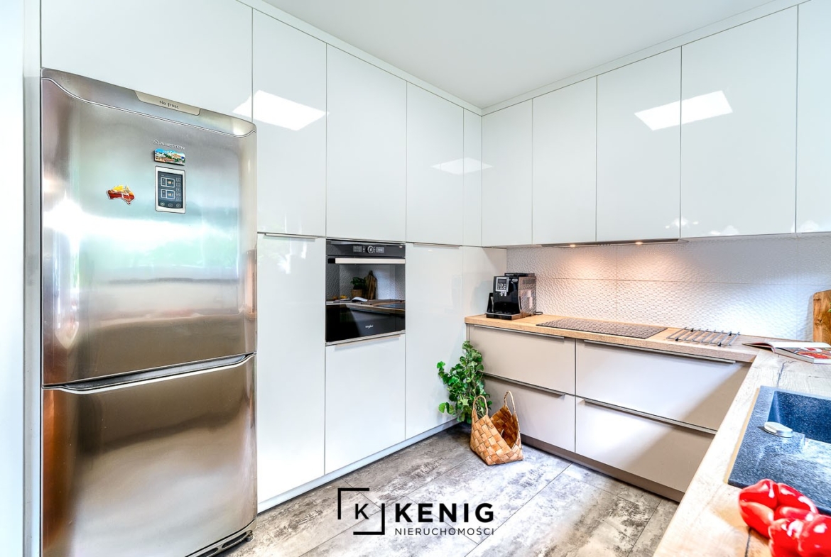 Kuchnia jest sercem tego domu – gospodyni znakomicie piecze (wiem, bo próbowałam 😉 ), gotuje i uwielbia przyjmować gości. Wspólnemu biesiadowaniu sprzyja wyspa kuchenna na granicy kuchni i jadalni i, oczywiście, ogromny stół, przy którym mieści się cała rodzina. Pomieszczenie kuchni jest bardzo praktycznie wyposażone w niezbędne sprzęty AGD (zmywarka, lodówko-zamrażarka, płyta indukcyjna, okap kuchenny), nie brakuje także miejsca do przechowywania kuchennych utensyliów i blatów roboczych. Meble i sprzęty są zaledwie kilkuletnie, a zabudowa bardzo nowoczesna, gustowna i przemyślana.