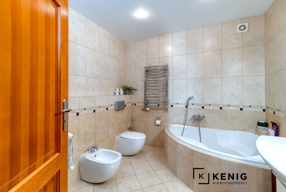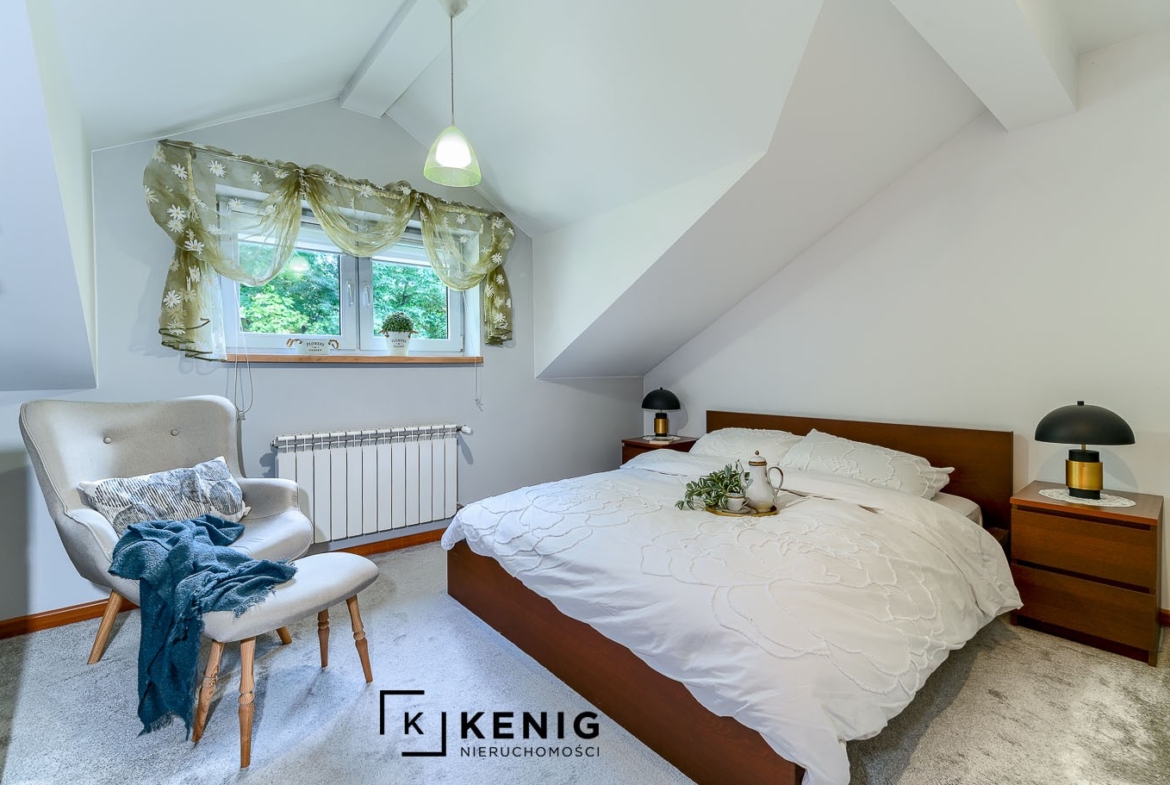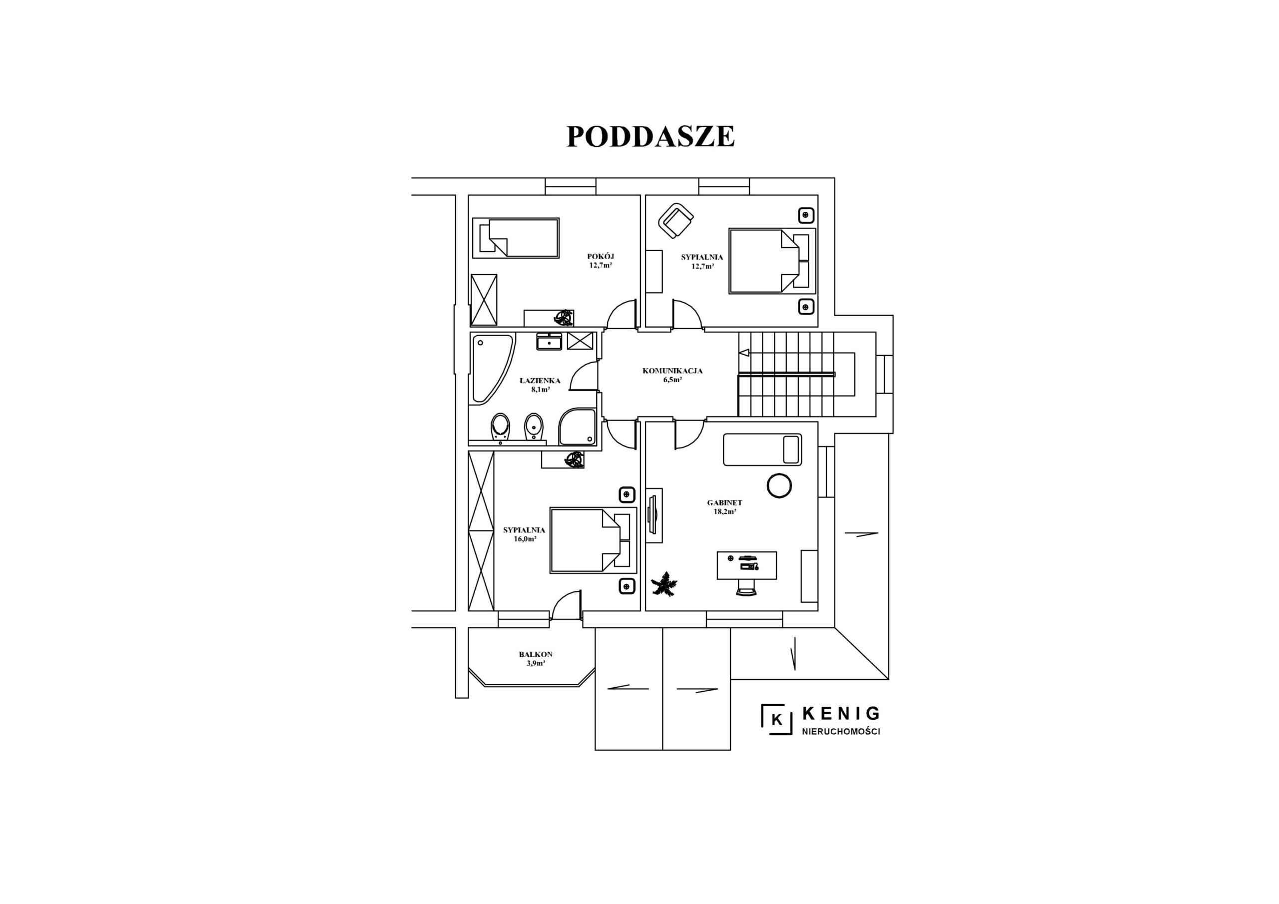 Na poddaszu, które z uwagi na ciekawy, indywidualny projekt budynku, z jednej strony jest w zasadzie pełnowartościowym piętrem, znajdują się trzy wygodne sypialnie oraz robiący wrażenie gabinet pana domu, który staje się dla niego czasami także miejscem błogiego odosobnienia i relaksu. Sporej wielkości łazienka z wanną, prysznicem, bidetem i toaletą spełnia potrzeby rodziny.