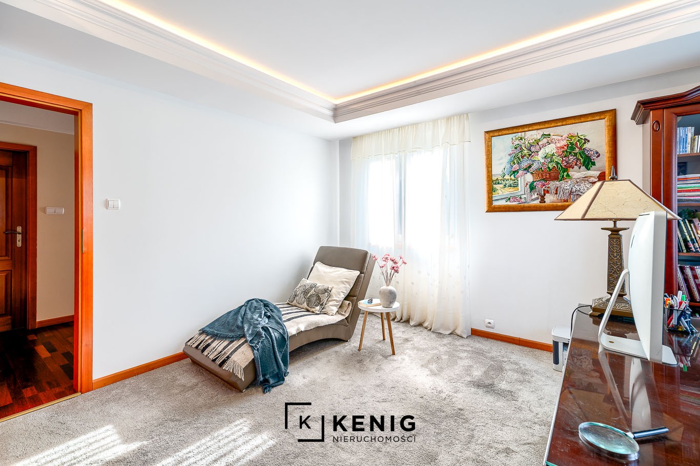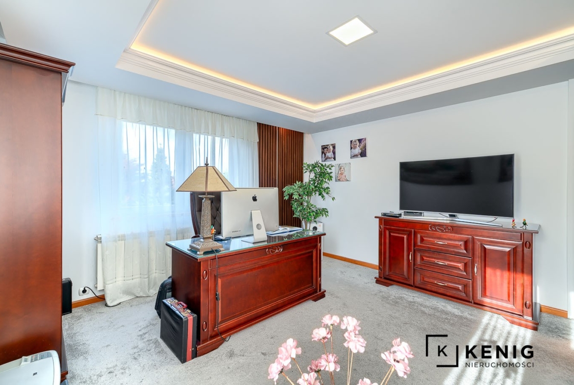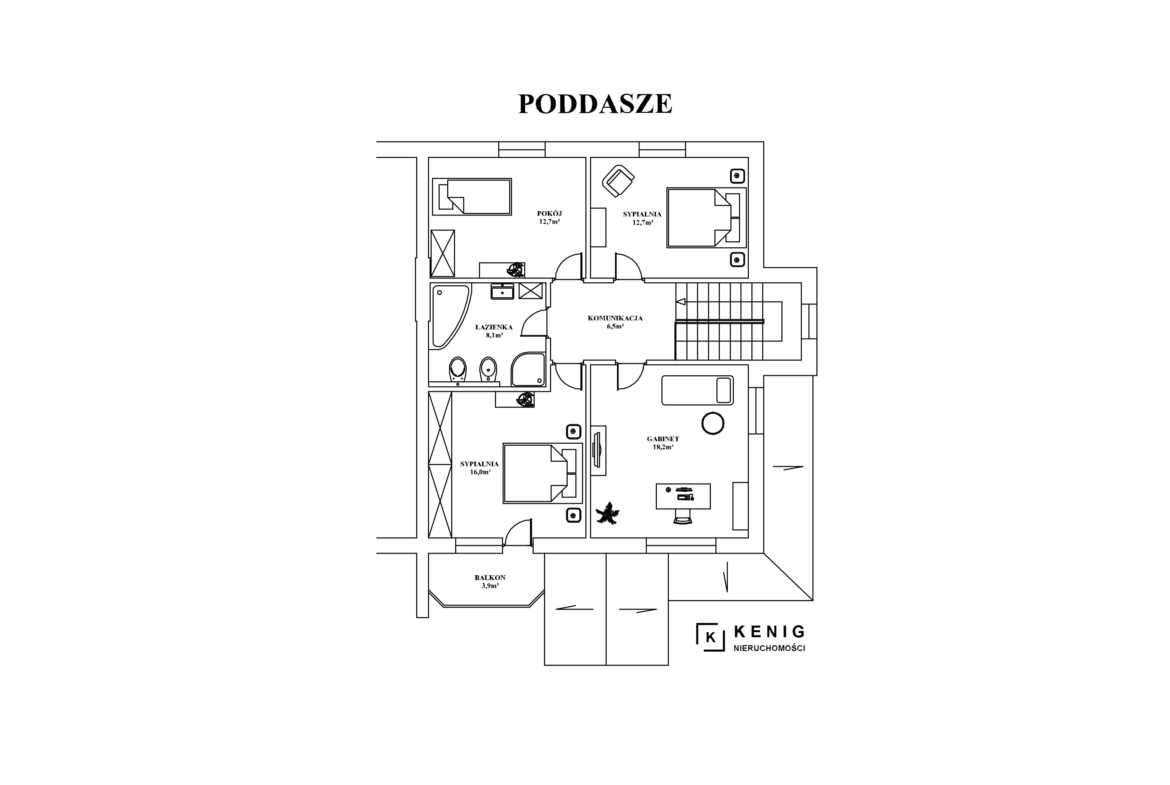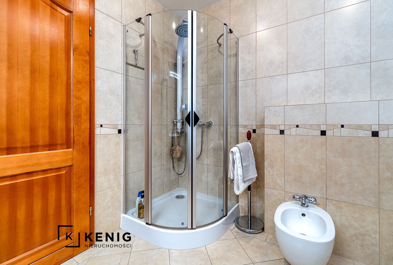 Na poddaszu, które z uwagi na ciekawy, indywidualny projekt budynku, z jednej strony jest w zasadzie pełnowartościowym piętrem, znajdują się trzy wygodne sypialnie oraz robiący wrażenie gabinet pana domu, który staje się dla niego czasami także miejscem błogiego odosobnienia i relaksu. Sporej wielkości łazienka z wanną, prysznicem, bidetem i toaletą spełnia potrzeby rodziny.