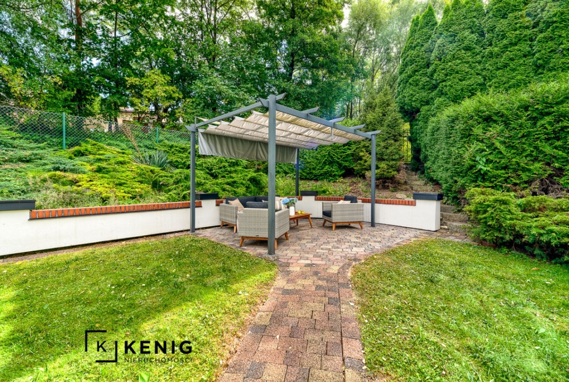 Ogród: Działka jest obecnie zagospodarowana w sposób niemal bezobsługowy, co może być atutem dla osób, które nie przepadają za koszeniem i pracami ogrodowymi, a także takich, które nie mają na to zbyt wiele czasu lub wykorzystywać będą dom jako weekendowy – wystarczy tu samojezdny robot koszący. Wzdłuż części ogrodzenia właściciele posadzili gęsty żywopłot oraz zimozielone krzewy, zapewniające intymność domownikom. Zaraz za granicą ogrodu jest starodrzew, który oprócz zapewnienia izolacji od wyżej położonych domostw, jest po prostu przepiękny o każdej porze roku. W jednym z narożników działki gospodarze stworzyli miejsce wypoczynku – pod pergolą mieści się zestaw mebli ogrodowych. Wielkość działki stwarza jeszcze inne możliwości aranżacyjne, według własnych potrzeb i upodobań – dzieci mogą z powodzeniem mieć tu swój plac zabaw, piaskownicę czy nieduży basen, a dorośli dodatkowo stół jadalniany i skrzynie na zioła, w pobliżu wyjścia z części kuchenno-jadalnianej domu. Opcji jest wiele. A wszystko to wśród istniejących już drzew i krzewów…